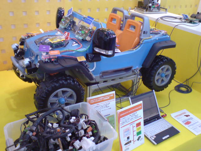 写真は、車の中にある組込み機器をさらに加速化させて行くと、写真左下にあるようなハーネスなどのコード類がいらなくなり、コンパクトな設計になることを表している展示になります。