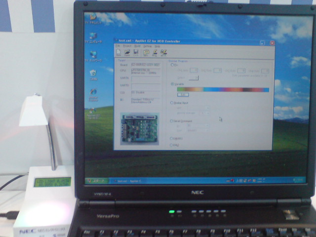 写真はそのマイコン操作の体験が行える装置で、左側にあるLED照明器具を、PC上のソフトウェアを使って制御できる体験セミナーとなっています。照明器具には、赤緑青の3つのLEDがあり、それぞれのLEDに流れる電流をマウスを使って制御が可能となっています。